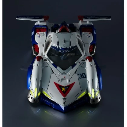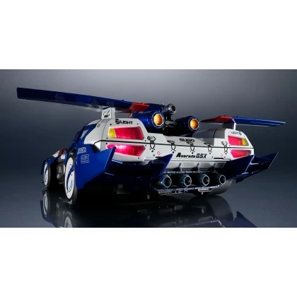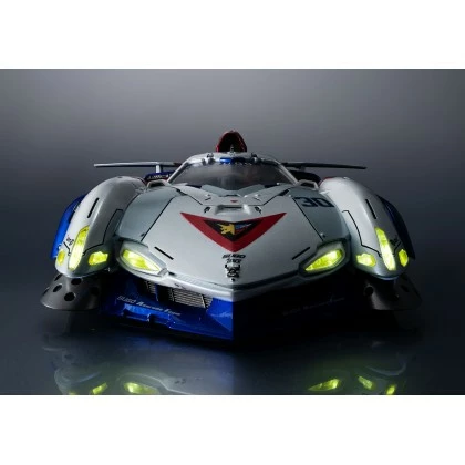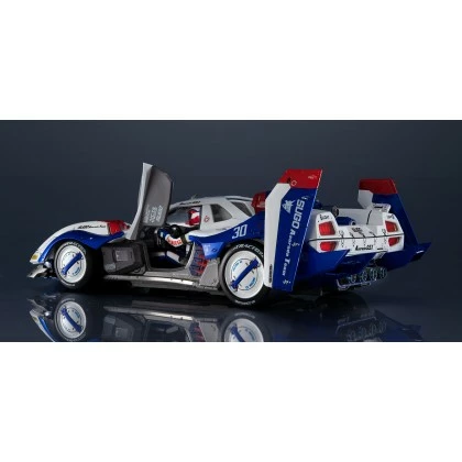 The body of VA Hi-SPEC ASURADA G.S.X is mainly made of zinc alloy (die-cast), POM, and ABS, and is painted with metallic coating. The die-cast enhances the weight and durability of the vehicle model and is combined with engineering plastic at the movable joints in order to increase the functionality of moving parts. The wheels are made of a soft PVC material to replicate a realistic rubber tire texture. A Hayato Kazami figure, with helmet, articulation, and detailed paint, is also included; which can be placed inside the vehicle model.